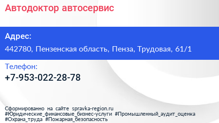Автодоктор, автосервис по адресу 442780, Пензенская область, Пенза, Трудовая, 61/1 в дальнейшем Организация, размещена в следующих категориях: