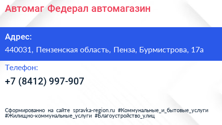 Автомаг/Федерал, автомагазин по адресу 440031, Пензенская область, Пенза, Бурмистрова, 17а в дальнейшем Организация, размещена в следующих категориях: