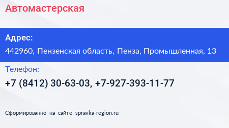 Автомастерская по адресу 442960, Пензенская область, Пенза, Промышленная, 13 в дальнейшем Организация, размещена в следующих категориях: