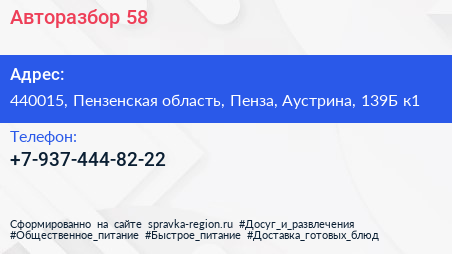 Авторазбор 58 по адресу 440015, Пензенская область, Пенза, Аустрина, 139Б к1 в дальнейшем Организация, размещена в следующих категориях: