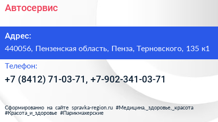 Автосервис по адресу 440056, Пензенская область, Пенза, Терновского, 135 к1 в дальнейшем Организация, размещена в следующих категориях: