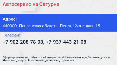 Автосервис на Сатурне по адресу 440000, Пензенская область, Пенза, Кузнецкая, 15 в дальнейшем Организация, размещена в следующих категориях: