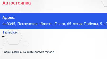 Автостоянка по адресу 440045, Пензенская область, Пенза, 65-летия Победы, 5 к2 в дальнейшем Организация, размещена в следующих категориях: