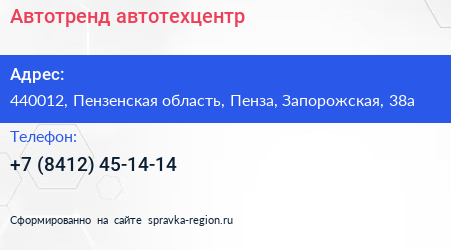 Автотренд, автотехцентр по адресу 440012, Пензенская область, Пенза, Запорожская, 38а в дальнейшем Организация, размещена в следующих категориях: