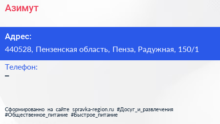Азимут по адресу 440528, Пензенская область, Пенза, Радужная, 150/1 в дальнейшем Организация, размещена в следующих категориях: