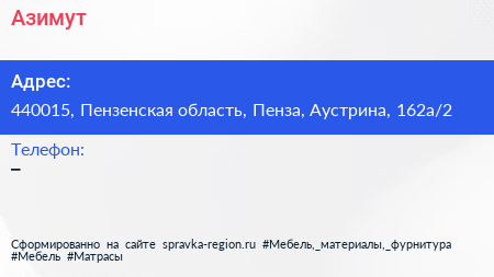 Азимут по адресу 440015, Пензенская область, Пенза, Аустрина, 162а/2 в дальнейшем Организация, размещена в следующих категориях: