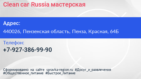 Clean car Russia, мастерская по адресу 440026, Пензенская область, Пенза, Красная, 64Б в дальнейшем Организация, размещена в следующих категориях: