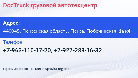 DocTruck, грузовой автотехцентр по адресу 440045, Пензенская область, Пенза, Побочинская, 1а к4 в дальнейшем Организация, размещена в следующих категориях: