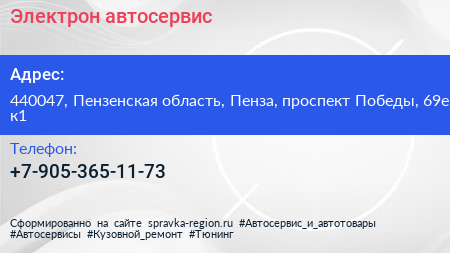Электрон, автосервис по адресу 440047, Пензенская область, Пенза, проспект Победы, 69е к1 в дальнейшем Организация, размещена в следующих категориях: