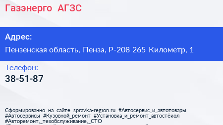 Газэнерго+, АГЗС по адресу Пензенская область, Пенза, Р-208 265 Километр, 1 в дальнейшем Организация, размещена в следующих категориях: