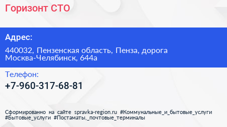 Горизонт, СТО по адресу 440032, Пензенская область, Пенза, дорога Москва-Челябинск, 644а в дальнейшем Организация, размещена в следующих категориях: