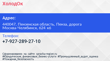 ХолодОк по адресу 440047, Пензенская область, Пенза, дорога Москва-Челябинск, 624 к6 в дальнейшем Организация, размещена в следующих категориях: