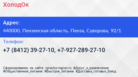 ХолодОк по адресу 440000, Пензенская область, Пенза, Суворова, 92/1 в дальнейшем Организация, размещена в следующих категориях: