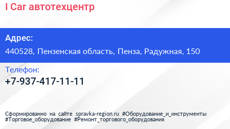 I Car, автотехцентр по адресу 440528, Пензенская область, Пенза, Радужная, 150 в дальнейшем Организация, размещена в следующих категориях:
