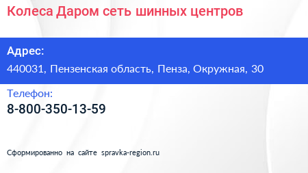 Колеса Даром, сеть шинных центров по адресу 440031, Пензенская область, Пенза, Окружная, 30 в дальнейшем Организация, размещена в следующих категориях: