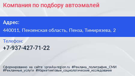 Компания по подбору автоэмалей по адресу 440011, Пензенская область, Пенза, Тимирязева, 2 в дальнейшем Организация, размещена в следующих категориях: