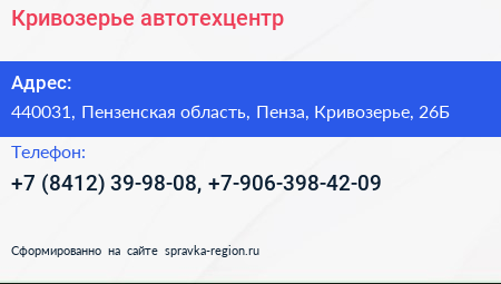 Кривозерье, автотехцентр по адресу 440031, Пензенская область, Пенза, Кривозерье, 26Б в дальнейшем Организация, размещена в следующих категориях: