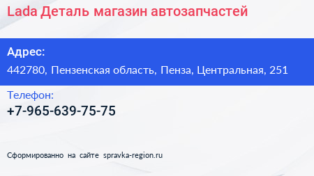 Lada Деталь, магазин автозапчастей по адресу 442780, Пензенская область, Пенза, Центральная, 251 в дальнейшем Организация, размещена в следующих категориях: