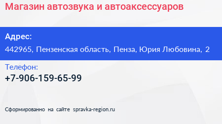 Магазин автозвука и автоаксессуаров по адресу 442965, Пензенская область, Пенза, Юрия Любовина, 2 в дальнейшем Организация, размещена в следующих категориях: