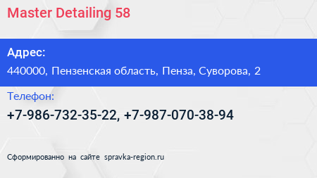 Master Detailing 58 по адресу 440000, Пензенская область, Пенза, Суворова, 2 в дальнейшем Организация, размещена в следующих категориях: