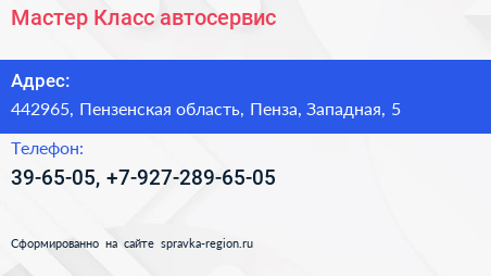 Мастер-Класс, автосервис по адресу 442965, Пензенская область, Пенза, Западная, 5 в дальнейшем Организация, размещена в следующих категориях: