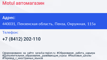 Motul, автомагазин по адресу 440031, Пензенская область, Пенза, Окружная, 115а в дальнейшем Организация, размещена в следующих категориях: