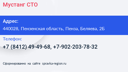 Мустанг, СТО по адресу 440028, Пензенская область, Пенза, Беляева, 2Б в дальнейшем Организация, размещена в следующих категориях: