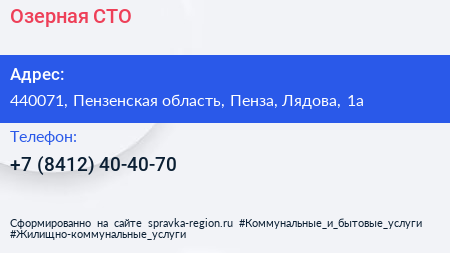 Озерная, СТО по адресу 440071, Пензенская область, Пенза, Лядова, 1а в дальнейшем Организация, размещена в следующих категориях: