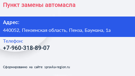 Пункт замены автомасла по адресу 440052, Пензенская область, Пенза, Баумана, 1а в дальнейшем Организация, размещена в следующих категориях: