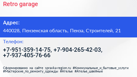 Retro garage по адресу 440028, Пензенская область, Пенза, Строителей, 21 в дальнейшем Организация, размещена в следующих категориях: