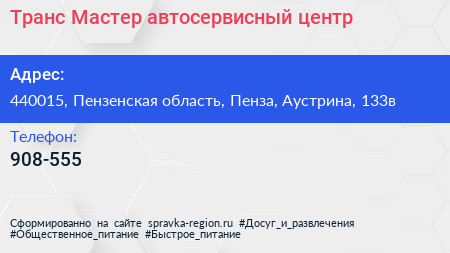 Транс-Мастер, автосервисный центр по адресу 440015, Пензенская область, Пенза, Аустрина, 133в в дальнейшем Организация, размещена в следующих категориях: