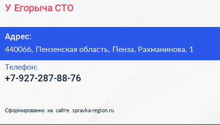 У Егорыча, СТО по адресу 440066, Пензенская область, Пенза, Рахманинова, 1 в дальнейшем Организация, размещена в следующих категориях: