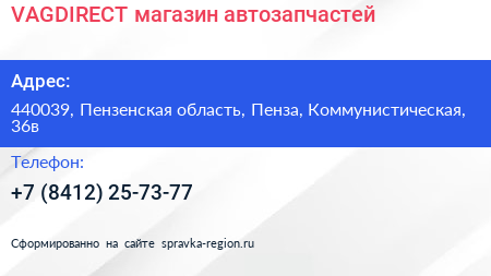 #VAGDIRECT, магазин автозапчастей по адресу 440039, Пензенская область, Пенза, Коммунистическая, 36в в дальнейшем Организация, размещена в следующих категориях: