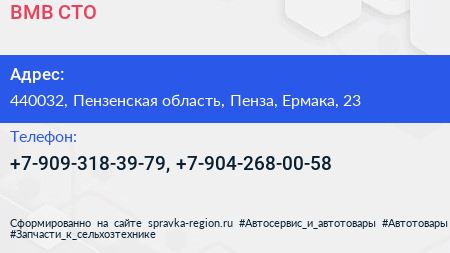 ВМВ, СТО по адресу 440032, Пензенская область, Пенза, Ермака, 23 в дальнейшем Организация, размещена в следующих категориях: