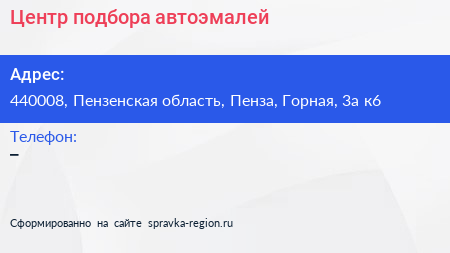 Центр подбора автоэмалей по адресу 440008, Пензенская область, Пенза, Горная, 3а к6 в дальнейшем Организация, размещена в следующих категориях: