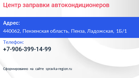 Центр заправки автокондиционеров по адресу 440062, Пензенская область, Пенза, Ладожская, 1Б/1 в дальнейшем Организация, размещена в следующих категориях: