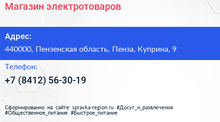 Магазин электротоваров по адресу 440000, Пензенская область, Пенза, Куприна, 9 в дальнейшем Организация, размещена в следующих категориях: