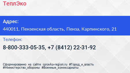 ТеплЭко по адресу 440011, Пензенская область, Пенза, Карпинского, 21 в дальнейшем Организация, размещена в следующих категориях: