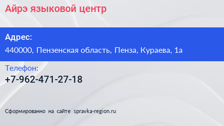Айрэ, языковой центр по адресу 440000, Пензенская область, Пенза, Кураева, 1а в дальнейшем Организация, размещена в следующих категориях: