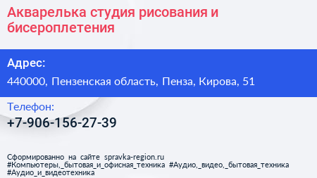 Акварелька, студия рисования и бисероплетения по адресу 440000, Пензенская область, Пенза, Кирова, 51 в дальнейшем Организация, размещена в следующих категориях: