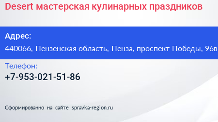 Desert, мастерская кулинарных праздников по адресу 440066, Пензенская область, Пенза, проспект Победы, 96в в дальнейшем Организация, размещена в следующих категориях: