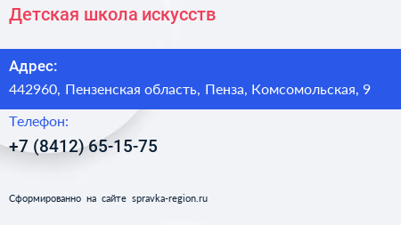 Детская школа искусств по адресу 442960, Пензенская область, Пенза, Комсомольская, 9 в дальнейшем Организация, размещена в следующих категориях: