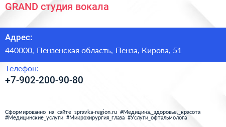 GRAND, студия вокала по адресу 440000, Пензенская область, Пенза, Кирова, 51 в дальнейшем Организация, размещена в следующих категориях: