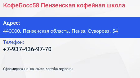 КофеБосс58, Пензенская кофейная школа по адресу 440000, Пензенская область, Пенза, Суворова, 54 в дальнейшем Организация, размещена в следующих категориях: