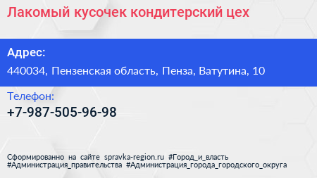 Лакомый кусочек, кондитерский цех по адресу 440034, Пензенская область, Пенза, Ватутина, 10 в дальнейшем Организация, размещена в следующих категориях: