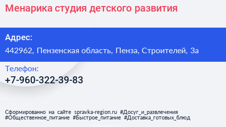 Менарика, студия детского развития по адресу 442962, Пензенская область, Пенза, Строителей, 3а в дальнейшем Организация, размещена в следующих категориях: