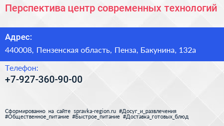 Перспектива, центр современных технологий по адресу 440008, Пензенская область, Пенза, Бакунина, 132а в дальнейшем Организация, размещена в следующих категориях:
