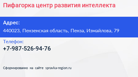 Пифагорка, центр развития интеллекта по адресу 440023, Пензенская область, Пенза, Измайлова, 79 в дальнейшем Организация, размещена в следующих категориях: