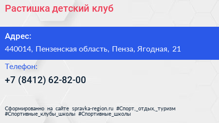 Растишка, детский клуб по адресу 440014, Пензенская область, Пенза, Ягодная, 21 в дальнейшем Организация, размещена в следующих категориях: