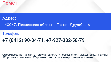 Ромет по адресу 440067, Пензенская область, Пенза, Дружбы, 6 в дальнейшем Организация, размещена в следующих категориях: